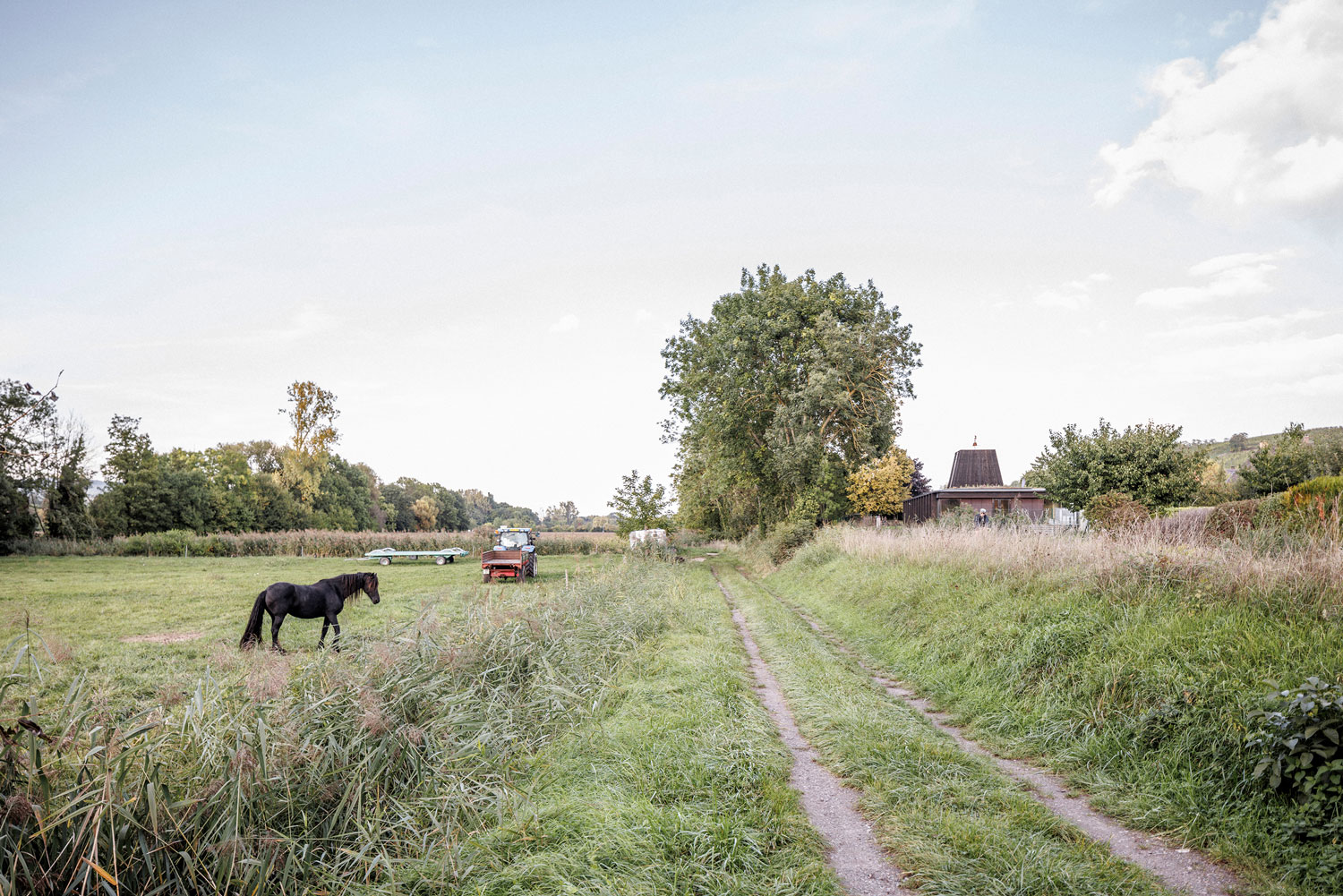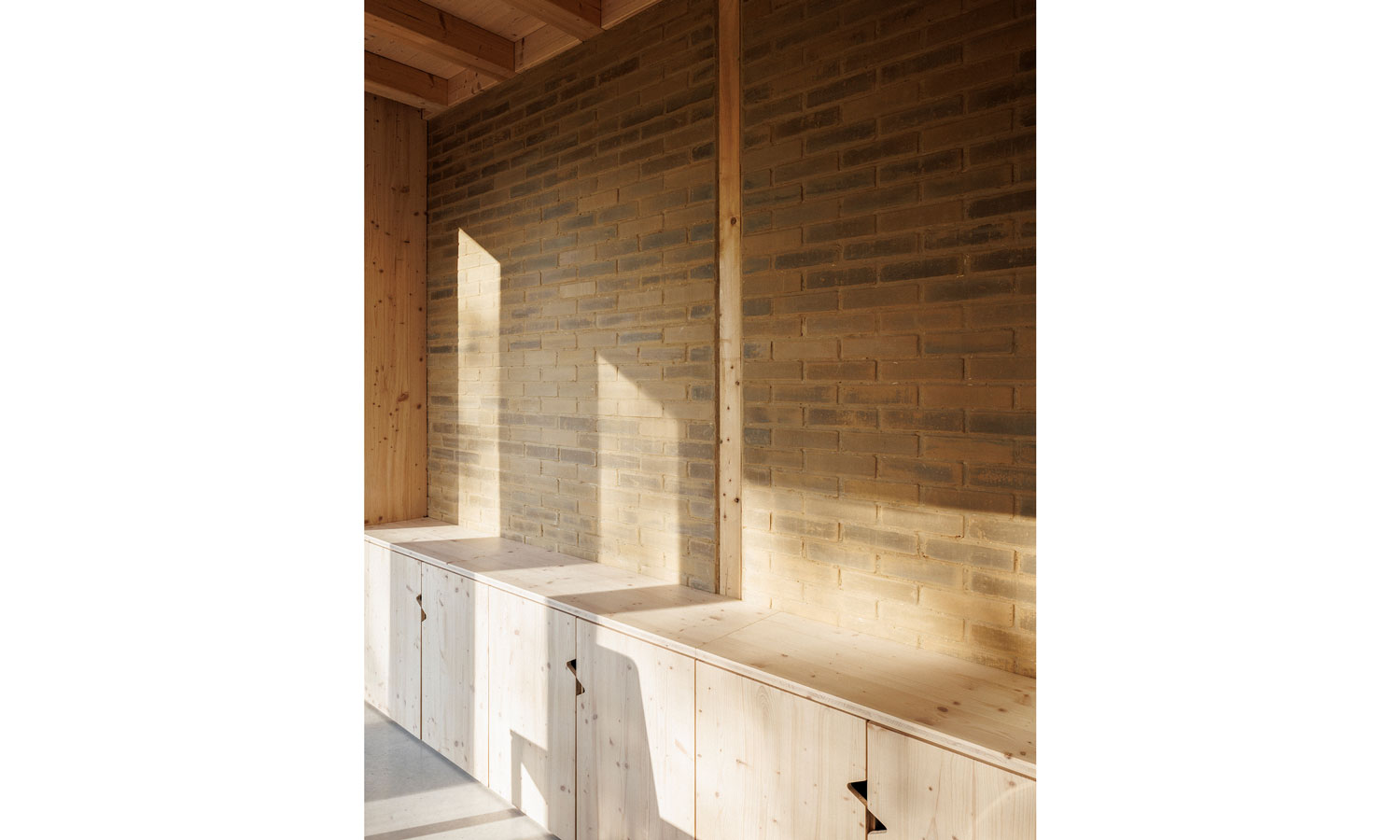 Cette émergence permet également une sur-ventilation naturelle du bâtiment participant activement au confort d’été. Les isolants sont biosourcés et apportent un fort déphasage thermique, couplé à l’inertie de la dalle béton, pour un bâtiment confortable en toutes saisons, ne nécessitant que très peu de chauffage (niveau Passivhaus) et aucune climatisation. Les cloisons intérieures sont en briques de terre crue, laissées apparentes ou recouvertes d’un enduit terre blanc. Ces briques, fabriquées par la briqueterie Lanter à 25km du chantier sont maçonnés avec un mortier de loess et de paille, comme les torchis de la tradition constructive alsacienne.