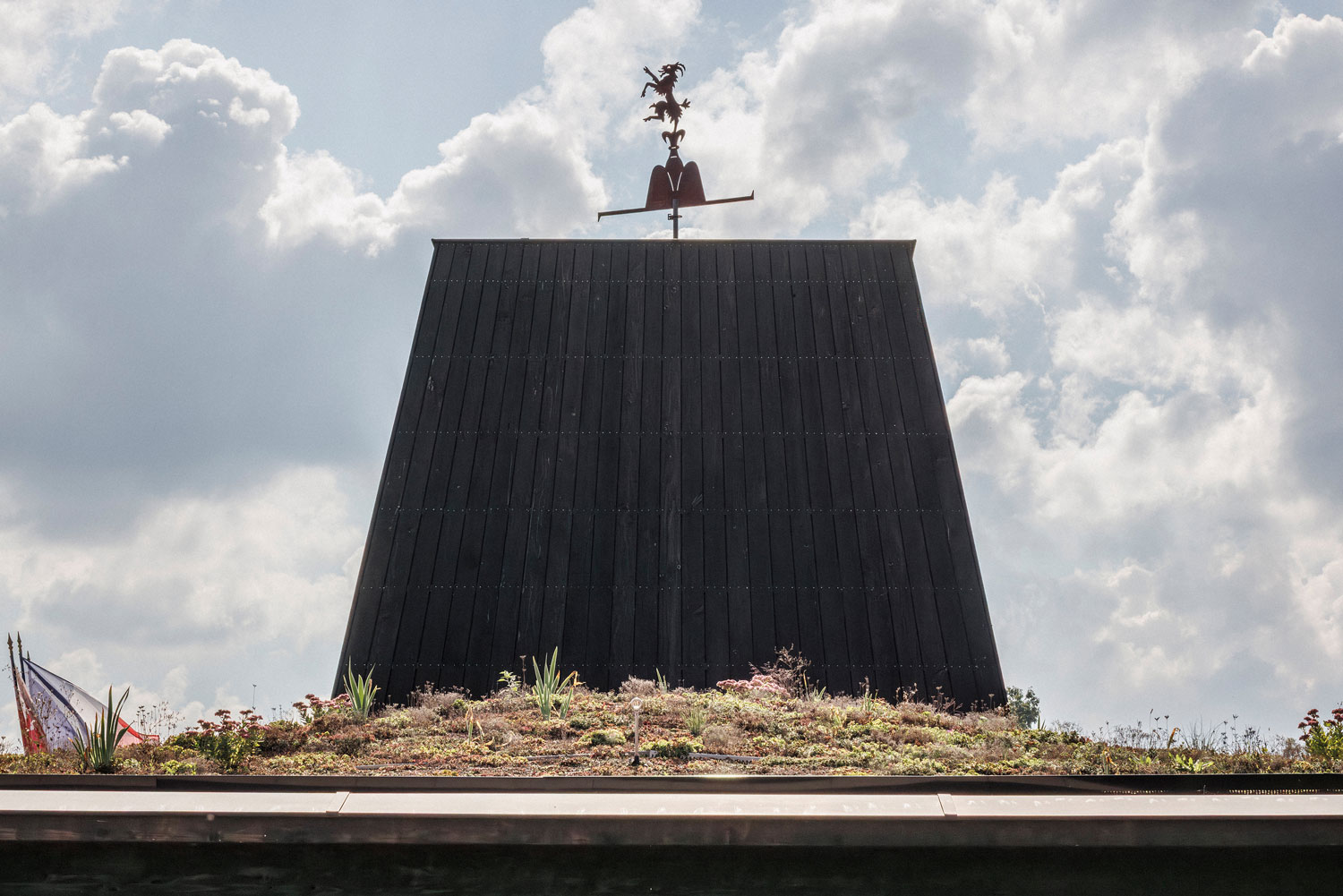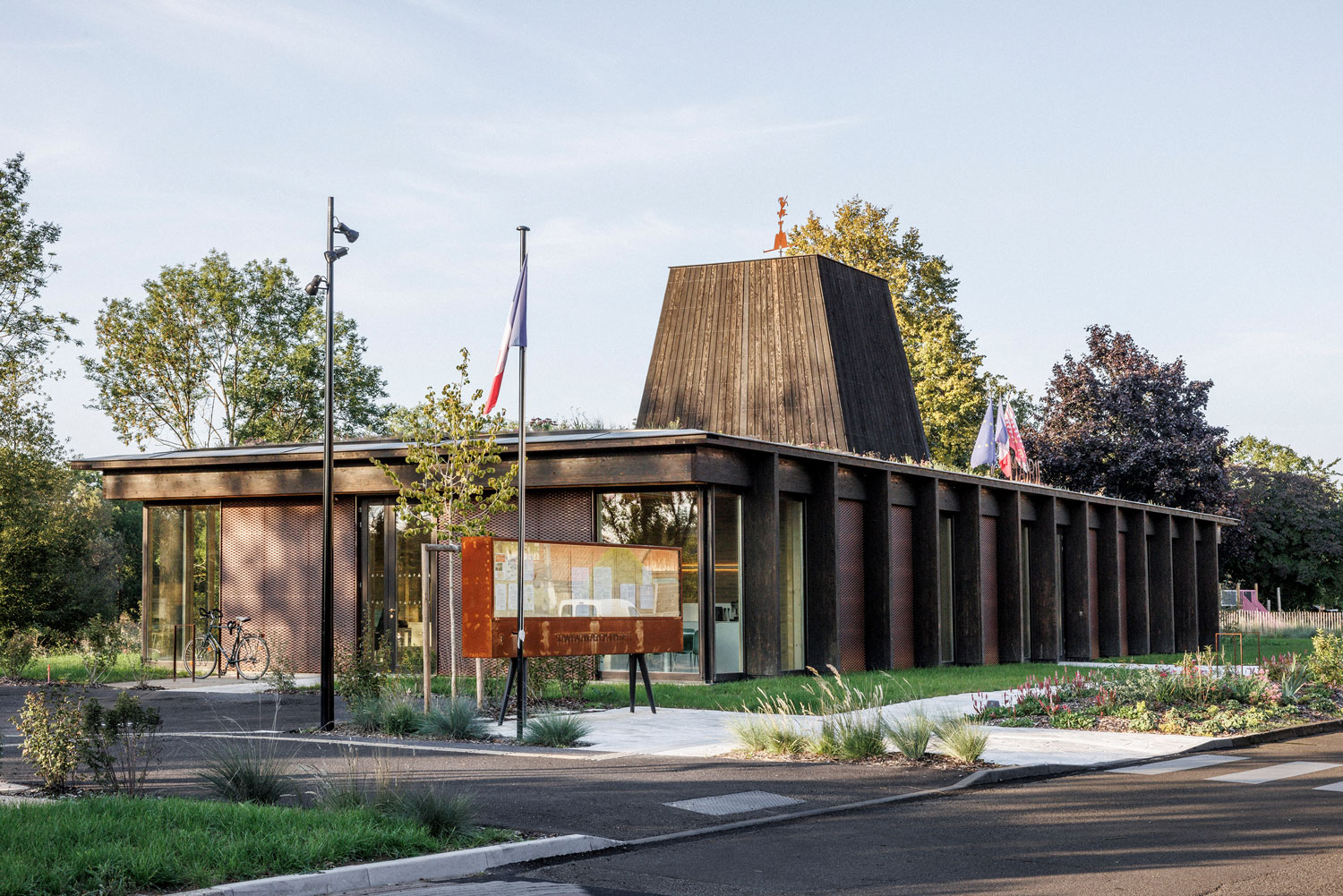 Au centre du bâtiment, une émergence construite offre un volume intérieur généreux au hall d’accueil, le cœur de cette nouvelle Mairie. Mais elle agit surtout comme un signal à l’échelle du village pour signaler la position de cette nouvelle centralité que doit constituer la future Mairie. Une girouette en cuivre reprenant les 2 blasons de la commune est installée au sommet et complète cette filiation à l’architecture villageoise traditionnelle tout en renouant avec le plaisir et l’émerveillement quasi enfantin des signes et symboles.