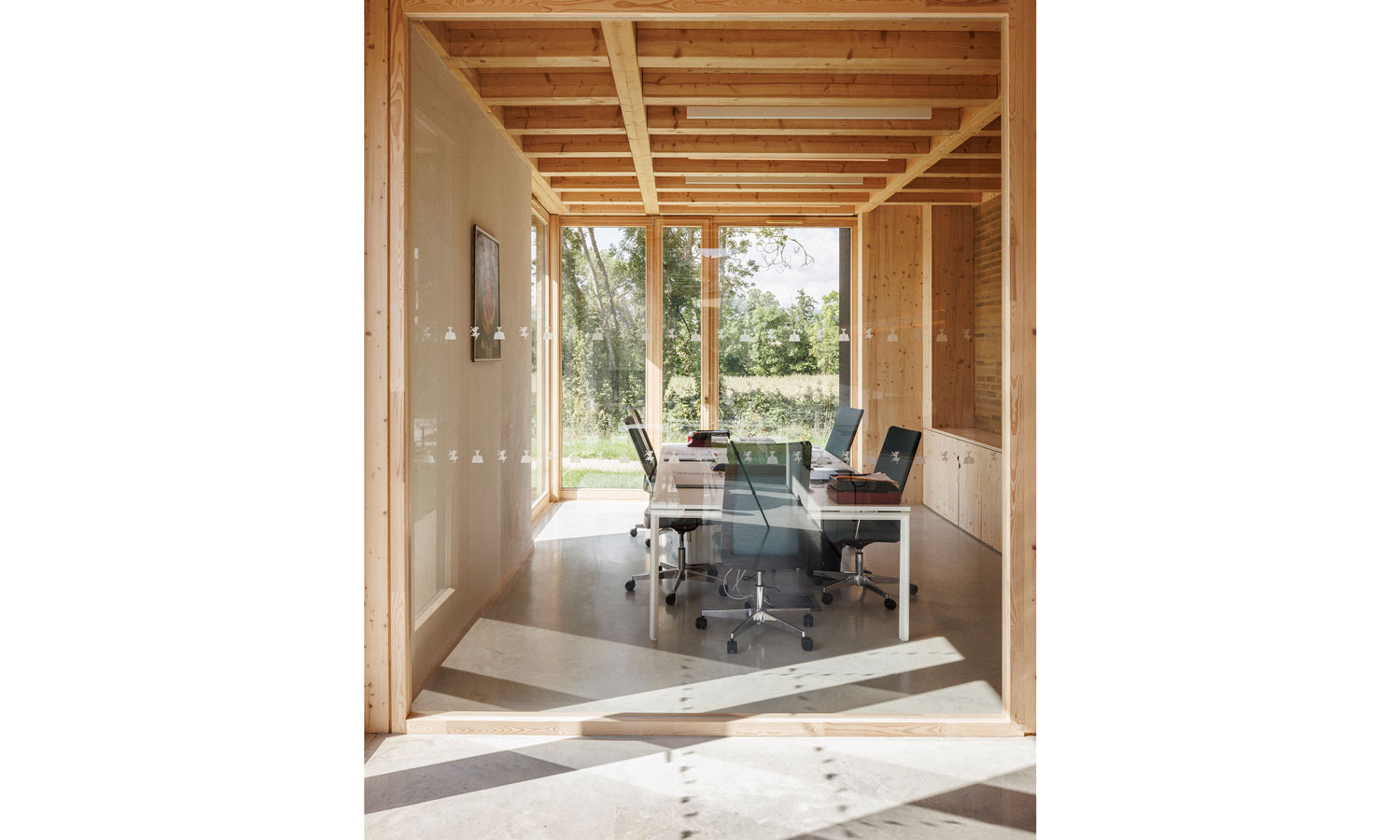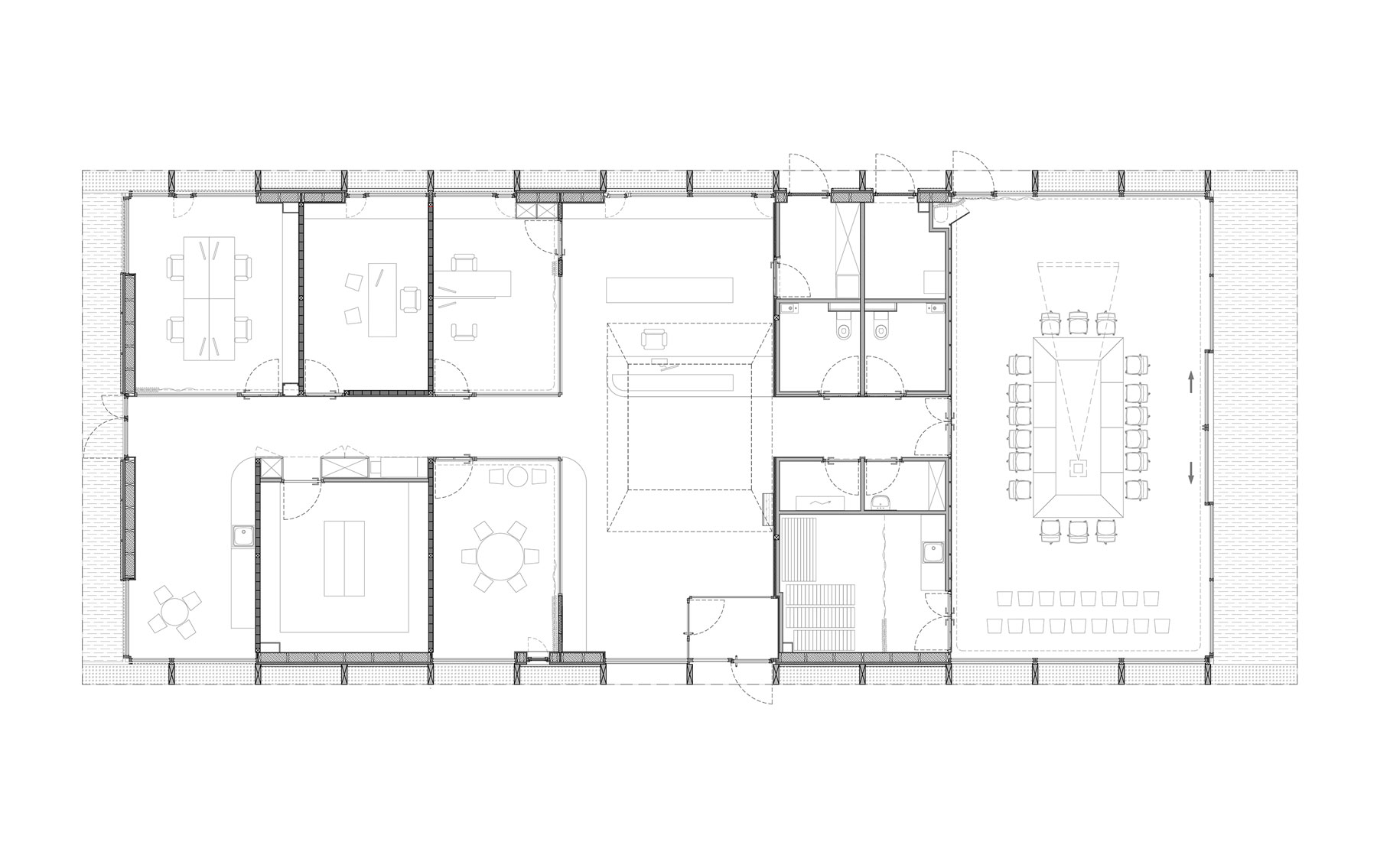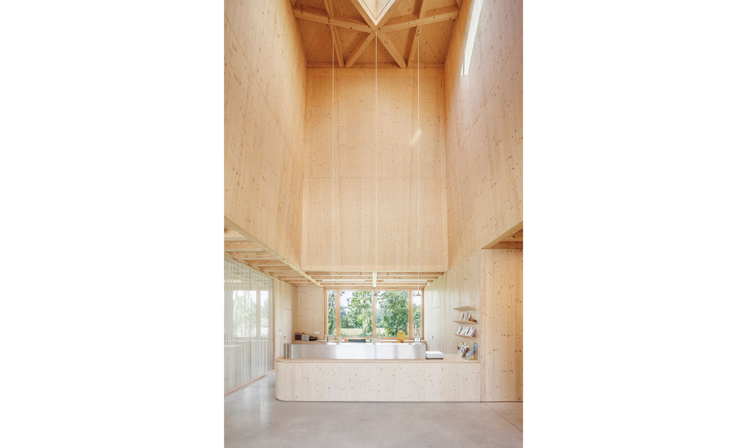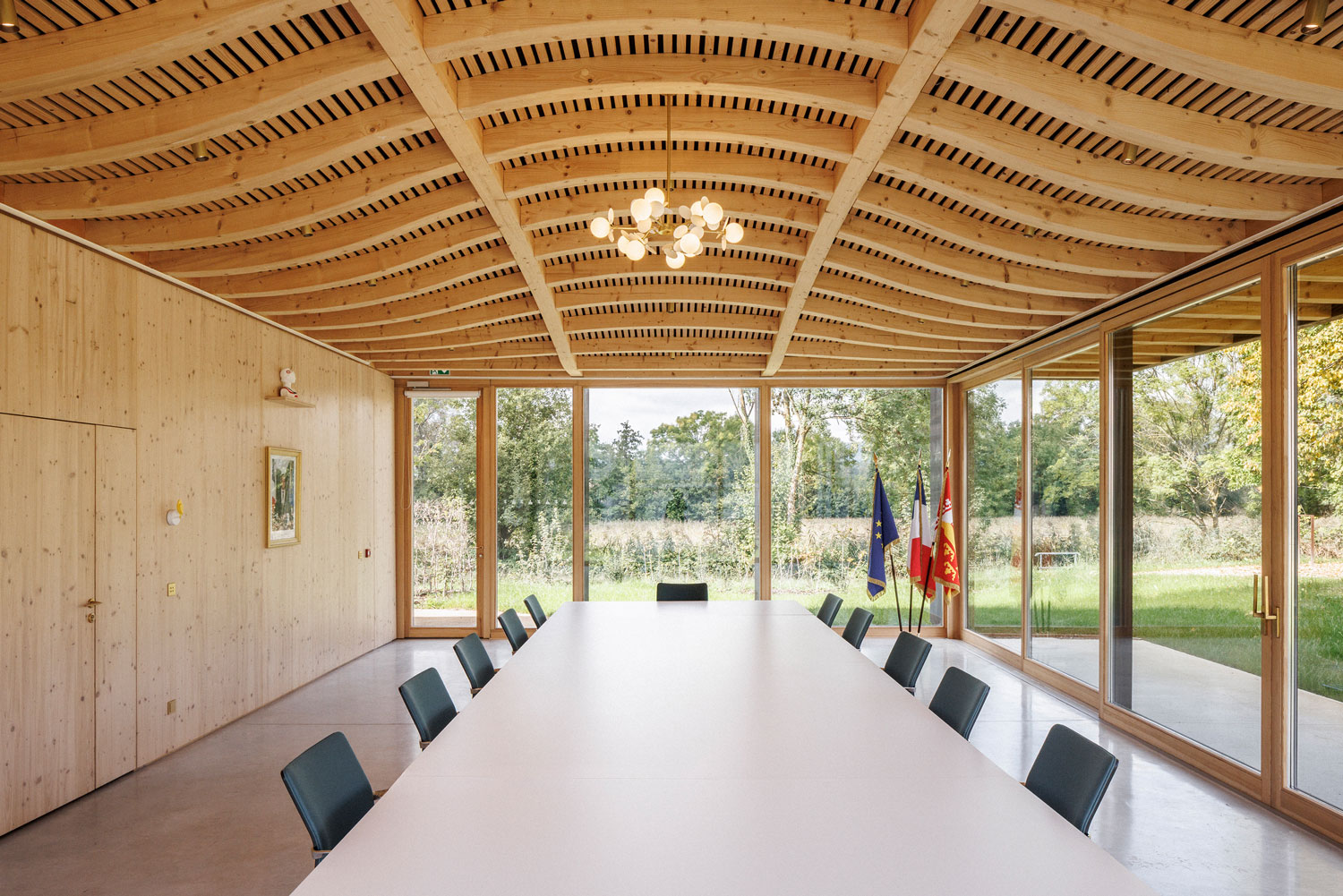 La salle du conseil s’ouvre généreusement sur l’extérieur par l’intermédiaire de deux grands châssis coulissants. Cette continuité intérieure/extérieure permet une utilisation variée, et une connexion directe avec ce nouvel espace de rencontre et de convivialité, à l’usage de tous.