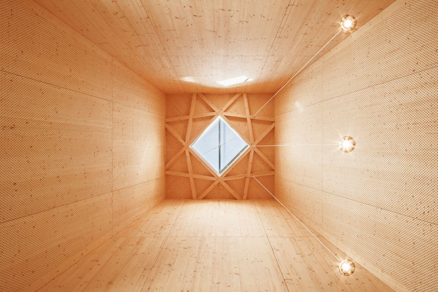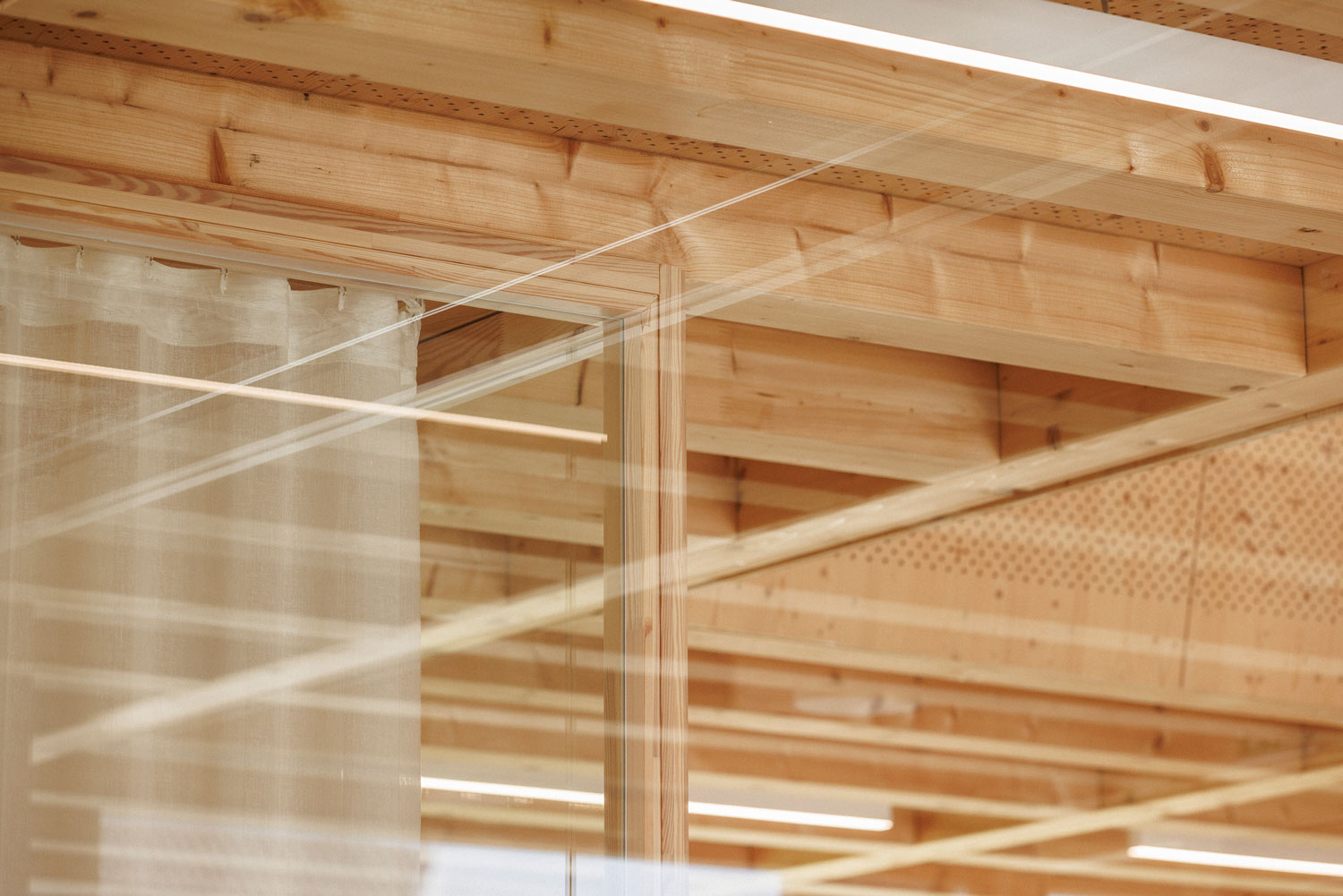 L’ensemble de l’ouvrage est en bois (charpente, murs ossatures bois, fenêtres et revêtements intérieurs). Les poutres maîtresses portent sur toute la largeur du bâtiment permettant une liberté d’aménagement et d’usages ultérieurs sans porteurs intermédiaires. Une sorte de Crown Hall, 100% bois ! La charpente à la française en bois massif local est laissée apparente dans l’ensemble du bâtiment. Au niveau de la salle du conseil et des mariages elle se déforme élégamment pour créer une voûte en bois donnant de l’ampleur et de la solennité à cet espace symbolique fort. Les solives courbes sont en bois massif découpé, reprenant ainsi un savoir-faire ancestral, sans recourir au collage, cintrage ou autre technique complexe. La numérisation permet une variété de profils créant une voûte à inertie variable dans les 2 directions.