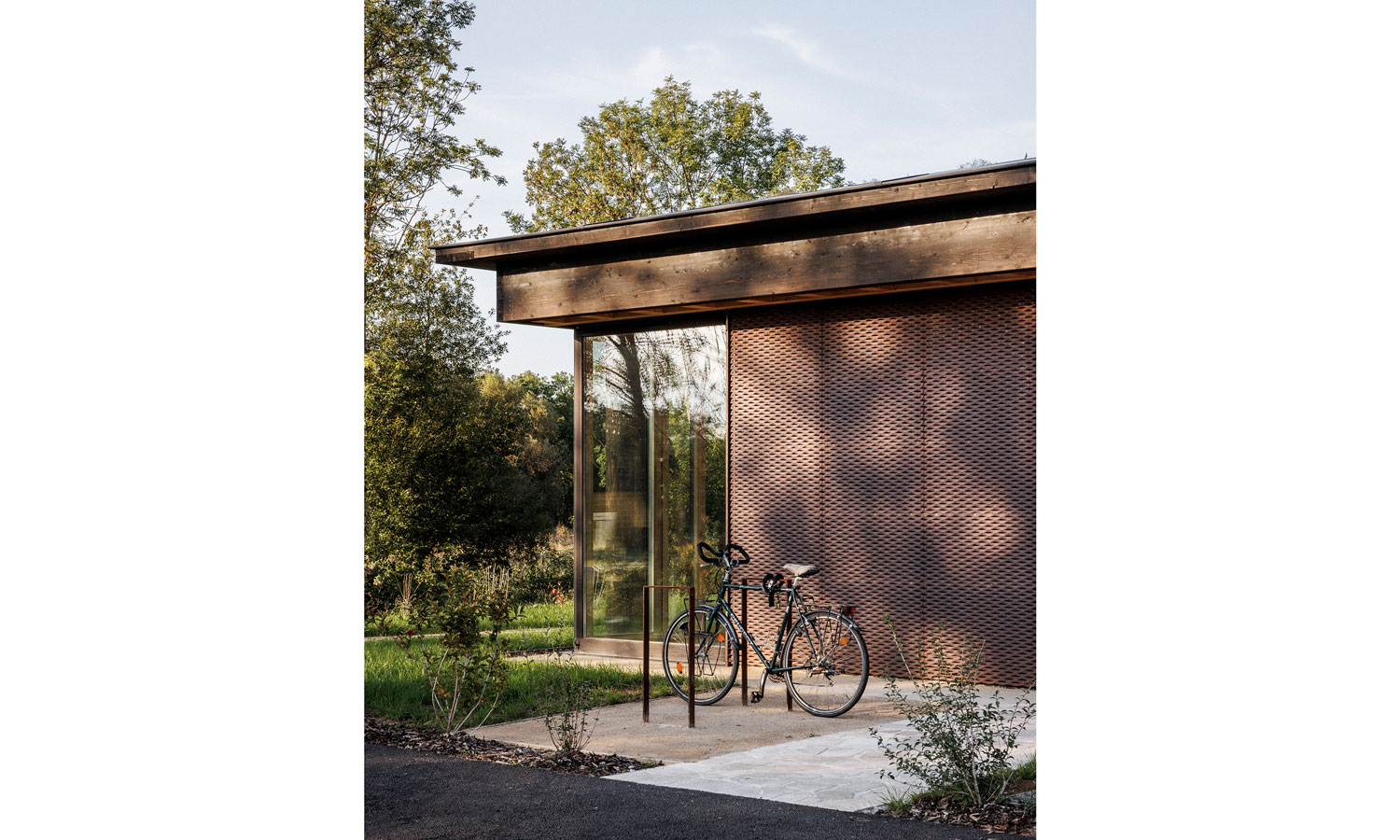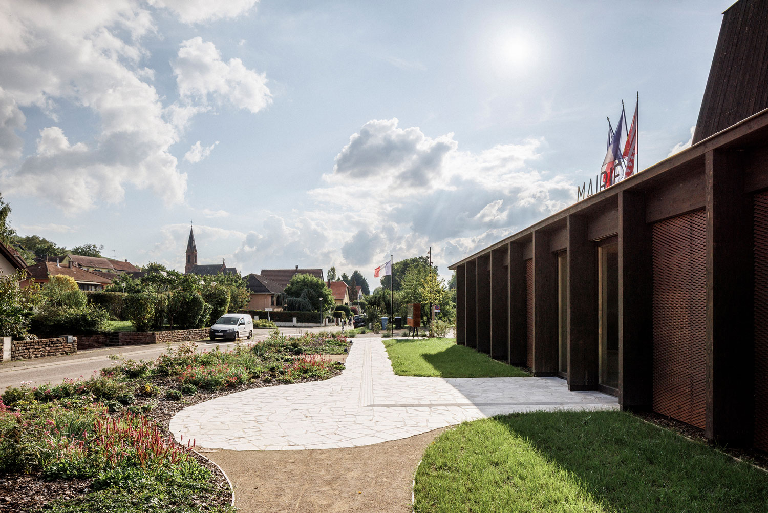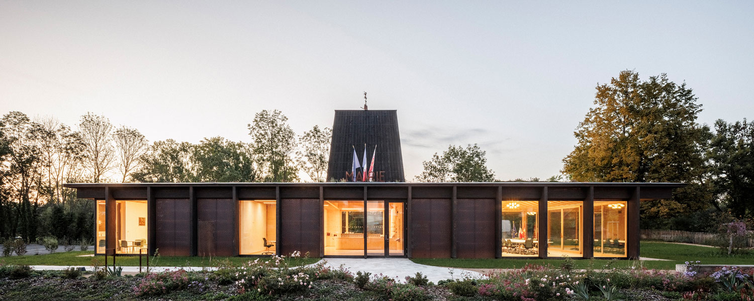 La nouvelle Mairie cherche l’horizontalité et la transparence pour s’intégrer à ce magnifique site arboré. La trame régulière de la structure bois placée à l’extérieur de l’édifice affirme la dimension publique du bâtiment, tout en garantissant une esthétique intemporelle, hors des modes. La teinte sombre et veloutée du goudron de pin protecteur et le dimensionnement affiné et élégant font écho à la fois aux colombages du village et aux arbres du site. Le bardage en maille déployée d’acier corten donne un aspect presque tissé à la façade et sa teinte rappelle les tons de la pierre locale (grès des Vosges) très présents dans le village historique. L’ensemble est contemporain mais ancré, rigoureux mais doux. Comme s’il avait toujours été là.