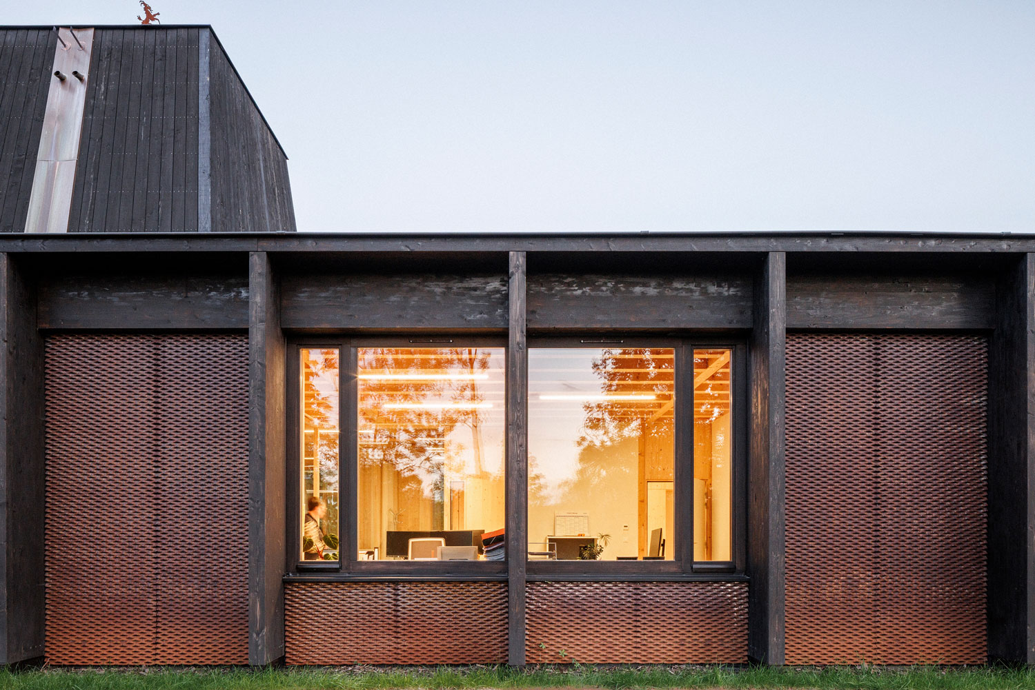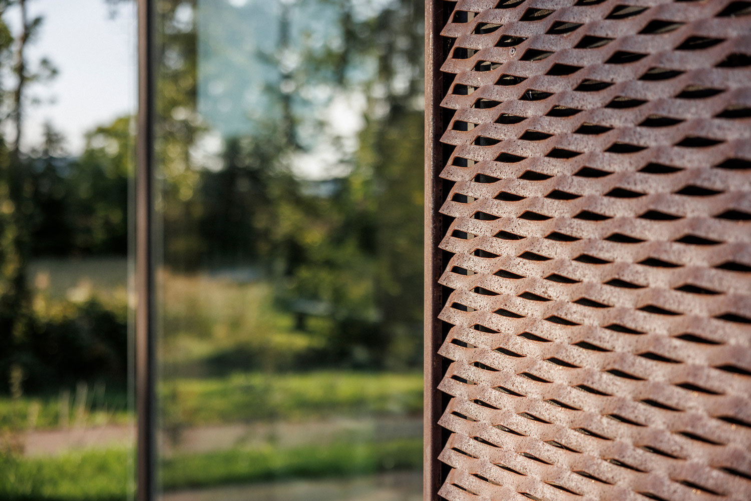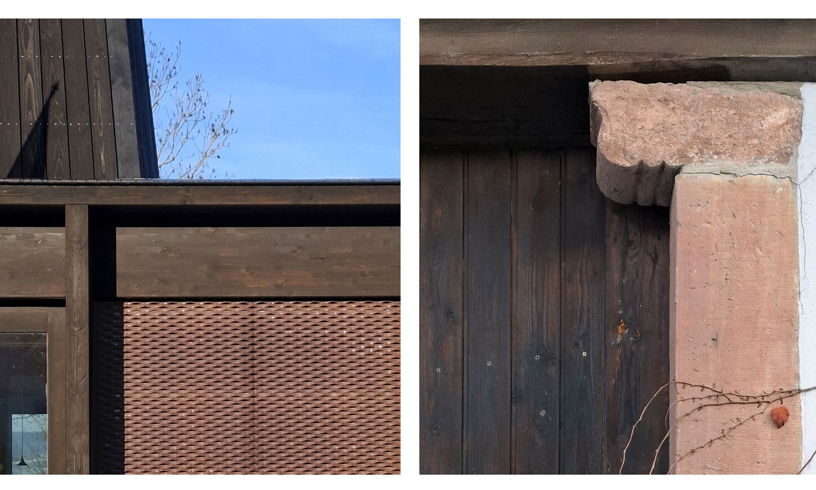 La nouvelle Mairie cherche l’horizontalité et la transparence pour s’intégrer à ce magnifique site arboré. La trame régulière de la structure bois placée à l’extérieur de l’édifice affirme la dimension publique du bâtiment, tout en garantissant une esthétique intemporelle, hors des modes. La teinte sombre et veloutée du goudron de pin protecteur et le dimensionnement affiné et élégant font écho à la fois aux colombages du village et aux arbres du site. Le bardage en maille déployée d’acier corten donne un aspect presque tissé à la façade et sa teinte rappelle les tons de la pierre locale (grès des Vosges) très présents dans le village historique. L’ensemble est contemporain mais ancré, rigoureux mais doux. Comme s’il avait toujours été là.